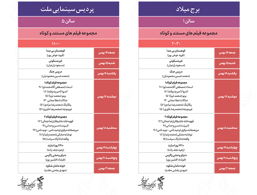 جدول نمایش آثار مستند و کوتاه که دیرهنگام اعلام شد، به شرح زیر است: